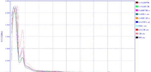 乙醇=1.86:98.14)、1%盐酸水溶液 (Vtim:V∗=3: :97)、60%甲醇水溶液、0.1%盐酸乙醇 (Vtin;Vz,n=0 .18:99.82)、60%乙醇水溶液甲醇、乙醇、蒸馏水。研磨,过滤,分别用不同的提取溶剂定容于50ml 容量瓶中,在200-1000nm 范围内测定吸光度,确定其最大吸收波长。