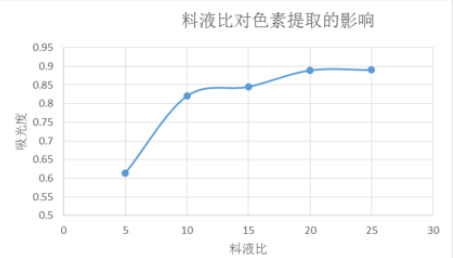称取 1g 样品,置于三角瓶中,置于三角瓶中后分别加入 5ml、10ml、15ml、20ml、25ml 的最佳提取溶剂,在温度为50℃情况下提取30min,后定容至50ml 容量瓶,测定吸光度,得出最佳提取液料比值。