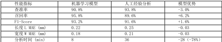 表 1 综合呈现了核心性能指标对比,充分展示了机器学习模型在此实践场景中的显著价值。模型展现出卓越的缺陷检出能力,召回率领先人工 6.2 个百分点,有效降低漏检风险。 尺寸量化精度优于人工(MAE 更低),结果更客观一致。尽管查准率有轻微差距, 体现综 力的提升。分析效率提升达78%,优势最为突出[2]。综合表 1 数据,该技术实现 面性(高召回率)、更高的尺寸量化精度(低 MAE)和更高的分析效率 高速度) 像判读负担,为风险评估与决策提供高质量输入,大幅减轻检验人员图像判读负担,为风险评估与决策提供高质量输入。