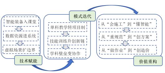联合地方政府、链主企业打造区域智能建造实训中心,集成5G+边缘计算服务器、工程物联网基站等新型基础设施,形成“教学-研发-应用”一体化平台,构建“技术赋能-教学模式迭代-价值重构”实施路径框架,如图1 所示。
