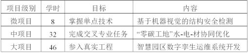 设计“微项目-中项目-大项目”三级进阶体系,如表 1 所示。通过这种三级进阶体系,学生可以从掌握单点技术开始,逐步过渡到完成跨专业任务,最终参与真实工程,全面提升自己的技术能力和实践经验。