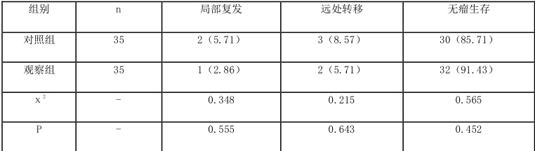 表1 示,两组两年内局部复发率、远处转移率以及无瘤生存率差异不明显, P>0.05 。