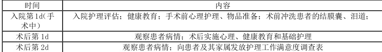 ②术前为患者进行心理疏导,安抚患者不良情绪;准备使用的手术用品;在术前3 天滴抗生素眼药水,3-4次/天。