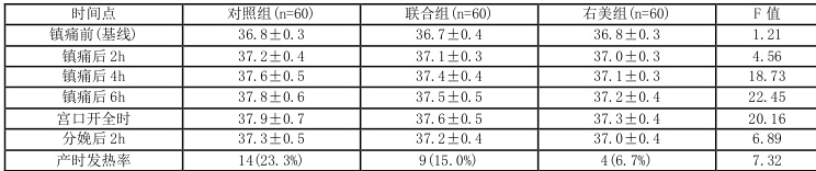 三组产妇体温随时间延长均呈升高趋势,但右美组体温升高幅度最小。具体而言:- 镇痛后4h:右美组体温(37. 1±0.3∘C) )显著低于对照组(37. 6±0. .5℃, P⟨0. 001)和联合组(37.4±0.4℃,P=0.002)- 宫口开全时:右美组体温(37.3±0.4℃)显著低于对照组(37. 9±0 .7℃,P<0.001)和联合组(37.6±0.5℃,P=0.001)- 产时发热率:右美组(6.7%)显著低于对照组(23.3%,P=0.008)和联合组(15.0%,P=0.046)[1][5]3.3 炎症因子水平变化