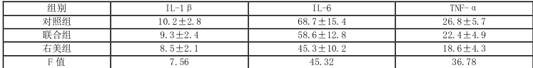 - IL-1β:右美组(8.5±2.1 pg/mL)低于对照组(10.2±2.8 pg/mL,P=0.002),与联合组 (9.3±2.4pg/mL) )差异无统计学意义(P=0.087)[1][5][8]