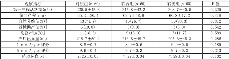 分娩方式:右美组自然分娩率(83.3%)高于对照组(71.7%)和联合组(