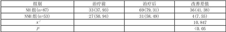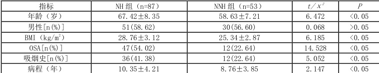 140 例患者中,NH 组 87 例(62.14%),NNH 组 53 例(37.86%)。NH 组患者年龄更大、BMI 更高,OSA 合并吸烟比例显著高于NNH 组 (P40.05) );两组性别构成无显著差异(P>0.05)。详见表1。