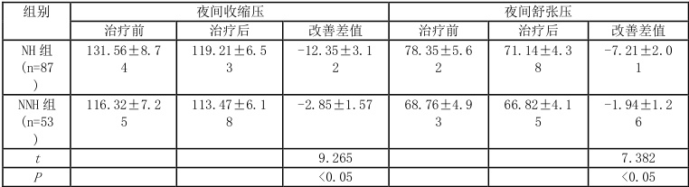 治疗12 周后,NH 组夜间血压改善幅度均显著大于NNH 组,且24 小时血压达标率提升更为明显 (P⟨0.05) 。