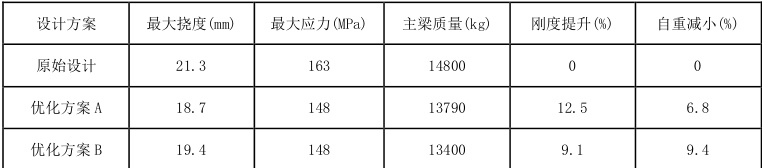 为验证优化效果,分别制定两套优化方案与原始设计进行对比。方案 A 通过截面调整提升结构刚度,方案B则采用高强材料实现轻量化。分析表明,两种优化策略均明显优于原始设计。主梁优化方案对比详情见表1。根据数据对照显示,方案A 在综合性能与经济性方面更具推广价值。