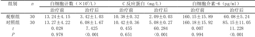 1.4.3 炎性因子水平:治疗前后,采集静脉血3m1,以全自动生化分析仪测定白细胞计数、C 反应蛋白水平,以放射免疫法检测白细胞介素-6 水平。