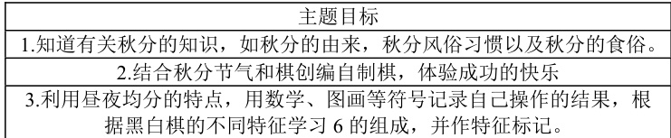 主题目标可以分为两个维度:主题总目标以及主题下具体活动的教学目标。这两个目标的确定都要依据《3-6 岁儿童学习与发展指南》,同时符合幼儿的发展需要。以班本课程“秋分棋”为例。制定了以下主题目标: