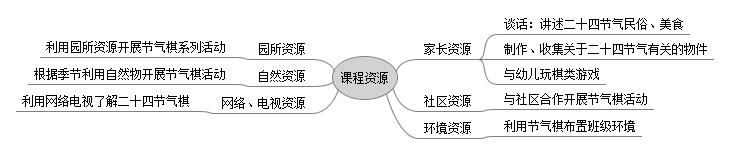 根据梳理得到的内容,我们首先从课程资源梳理身边的资源,分别从家长资源、自然资源、网络资源和园所资源这几个方面进行梳理。下面是梳理后资源的思维导图。
