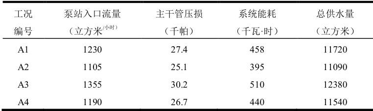 流量数据的深度挖掘不仅服务于日常监测,更在管网结构调整与供水策略优化中发挥支撑作用,在双流机场东区管网优化项目中,借助对关键输水节点的历史流量进行聚类归一化处理,结合水力模拟软件构建运行仿真模型,对不同工况下的供水路径与能耗分布进行评估,表 1 为该项目在四种典型场景下的模拟结果数据,包含泵站入口流量与能耗及系统总供水量。