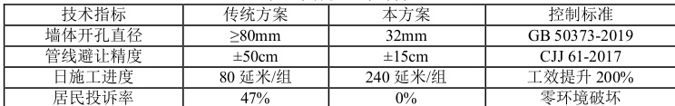明园小区(1985 年建)地下管线密度达 38 条/百米,燃气管网安全间距仅 0.28m (低于《CJJ/T 98-2014》规定的 0.5m );荣盛小区为70 年代砖混结构,墙体抗压强度检测值≤15MPa(GB/T 50344-2004),传统钻孔破损率达 65% ,施工安全风险等级评定为 III 级。