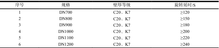 2.3.5 浇注旋转延时。DN700-1200 中大型 T 型接口管浇注旋转延迟时间如下