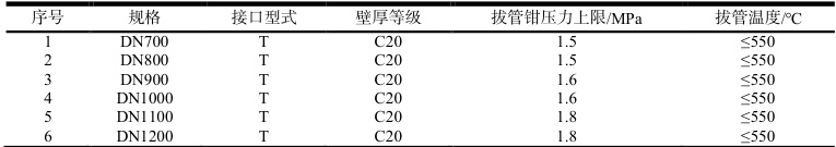 2.3.6 拔管压力及温度控制。水冷拔管压力不得过高造成拔裂或椭圆。DN700-1200 管径 T 型接口拔管钳压力及拔管温度控制如下表2: