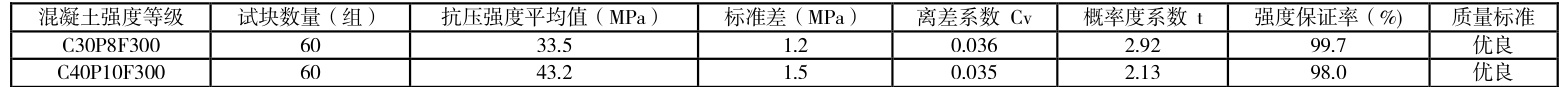 共制作混凝土标准立方体试块 120 组,其中 C30P8F300 混凝土试块 60组,C40P10F300 混凝土试块 60 组。检测结果显示,C30P8F300 混凝土试块的抗压强度平均值为 33.5MPa,标准差为 1.2MPa,离差系数 Cv=1.2÷33.5=0.036 <0.14 (R #≥20Mpa );概率度系数 t=(33.5-30)÷1.2=2.92 ,对应强度保证率为99.7% 。C40P10F300 混凝土试块的抗压强度平均值为 43.2MPa ,标准差为1.5MPa ,离差系数 Cv=1.5÷43.2=0.035<0.14 (R #≥20Mpa );概率度系数t=(43.2-40)÷1.5=2.13 ,对应强度保证率为 98.0% 。因此该批次 C30P8F300 和C40P10F300 混凝土试件质量达到优良。