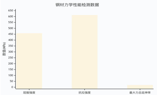 选取不同规格的 HRB400E 螺纹钢共 30 组,按组别进行检测(每组钢筋数量满足 GB 1499.2-2024 中 7.1.1 表 8 的规定)。拉伸试验结果显示,30 组钢材的屈服强度最大值 460MPa,最小值 430MPa;抗拉强度最大值 620MPa、最小值580MPa;最大力总延伸率最大值 16% 、最小值 12% 。30 组钢筋的屈服强度、抗拉强度和最大力总延伸率均满足规范要求。