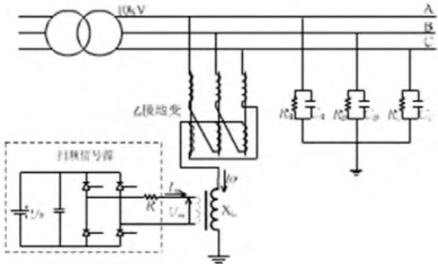 在铁路的供电系统之中,在出现频率信号改变的时候,可以通过这种方便来进行处理,主要是可以通过对于对于一个相对较为稳定的信号进行检测,从而断定发生故障的位置。例如:谐振接地故障就可以用这种方面来进行检测。在准确定位故障的方面上注入信号法是,比较常见的一种方法。当配电系统发送相关的信息和信号时,安装可以移动或者固定好的信号检测设备,及时准确的判断故障所在位置和方向。这种方式对于技术人员也是非常方便和有利,可以借助专门的设备来进行。有接地故障时,将零序信号电源加入故障系统,根据是否探测到该信号进行故障选线和定位,探测完成后,将零序诊断信号源从系统中退出。信号电流与故障电流相比小得多,同时故障线路中仍有符合电流流通。注入信号电流与负荷电流相比也小得多,单相接地故障电流和符合电流均由工频及其各次谐波构成。为此,必须采取适当的措施探测该信号,并使探测器对注入信号的频率有非常高的灵敏度。诊断信号电流可通过零序电流互感器测量,也可通过测量诊断喜好产生的磁场而得到。如图 1 所示。