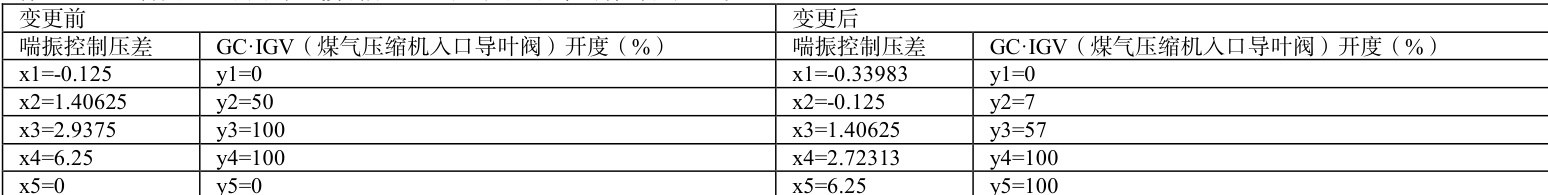通过以上方案调整,煤压机出口燃气旁路流量调节阀A最小关至 10% 开度,为目前A阀最低调整下限,既最大调整范围为 22.9%~10% ,这也是三菱公司对该机组稳定运行能给出的最低值。正常工况下,保持最小开度10% 运行。当遇有CPFM(燃烧室压力波动)高报警、煤压机IGV(煤气压缩机入口导叶阀)开度压力设定动作等异常工况时,需要重复以上 1 至 4 步,反向以 2% 增幅增大煤压机出口燃气旁路流量调节阀A开度,直至报警或异常恢复,最后将第 5 步参数设定复原。