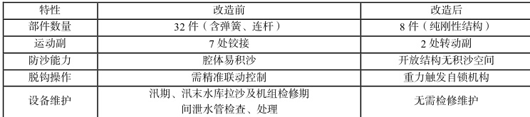 青铜峡水电站泄水管工作闸门自动抓梁脱钩装置改造是一次成功的技术实践。通过简化结构(部件减少75% )、增设椭圆支撑块、触发机制创新(重力-斜面自锁)及防淤设计优化(开放结构)等技术改进措施,有效解决了设备投入运行40 多年以来存在的脱钩装置因积沙发卡、冬季结冰无法操作等问题。经过4 年多的实际检验,在各种复杂工况下,抓梁均未发生卡沙、无法脱钩等故障,充分验证了改造方案的科学性、有效性和可靠性。其技术路线对多泥沙河流水电工程具有普适价值,也为后续电站机组尾水闸门自动抓梁改造成功提供了可靠技术支撑和宝贵经验。