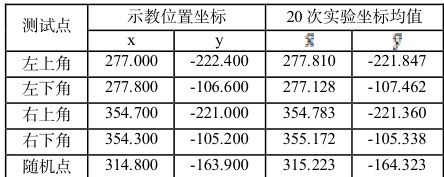 本文设计的定位算法在物料平台的四个角落及一个任意选取的参考点上进行了验证,每个点位均执行 20 次重复定位。表 1 展示了 20 次定位位置均值与通过示教操作记录的实际空间坐标之间的对比分析结果。