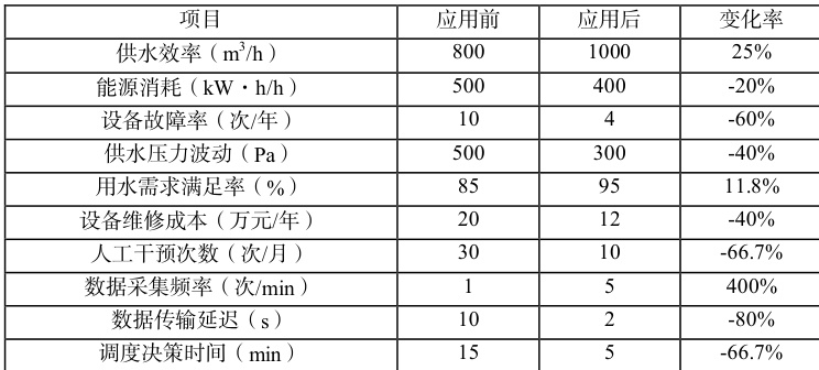 表 1 所示为 A 项目泵站数据驱动泵站智能调度技术应用相关数据。通过对表 1 数据进行分析发现,A 项目通过应用数据驱动的智能调度技术,供水效率提高 25% 、能源消耗降低 20% 、设备故障率下降 60% 、供水压力波动减少 40% 、用水需求满足率提升至 95% 、设备维修成本降低 40% 、人工干预次数降低 66.7% 、数据采集频率提高 40% 、数据传输延迟降低 80% 、调度决策时间降低 66.7% 。由此可见数据驱动的智能调度技术使泵站运行效率、服务质量得到有效提升、运行成本显著降低,数据采集和处理能力得到显著提高,加快调度决策速度,为城市安全供水提供保障。