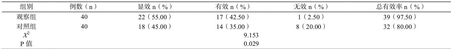 参与研究的患者共计 80 例,对照组和观察组包含的患者例数均为 40例。对照组中,男性患者 23 例,女性患者 17 例,患者年龄 22 至 59 岁,平均年龄( 39.8±5.6 )岁。观察组中,男性患者 24 例,女性患者 16 例,患者年龄 23 至 60 岁,平均年龄( 39.5±4.4 )岁。