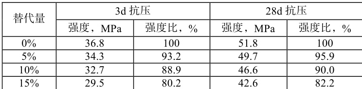 通过掺入不同量的提铝残渣( 0% 、 5% 、 10% 、 15% )替代硅酸盐水泥,研究其对胶砂抗压强度的影响,结果见表 2。由表 2 可知,随着提铝残渣替代量的增加,水泥胶砂的 3d 和 28d 抗压强度基本呈下降趋势。