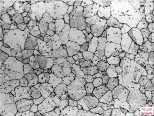对1、2号试样制取金相样,在Leica DMI 3000M型光学显微镜下进行横截面金相组织观察。图1为高温过热器管母材的显微组织,为奥氏体+析出相,采用DL/T 1422-2015《18Cr-8Ni系列奥氏体不锈钢锅炉管显微组织老化评级标准》对母材组织进行评定,晶内存在较多稍粗化的第二相,晶界上有略多粗化的第二相,整体为中度老化的状态,因此评定母材组织球化等级为3级。图2为屏式过热器管母材的显微组织,为奥氏体+析出相,采用DL/T 1422-2015《18Cr-8Ni系列奥氏体不锈钢锅炉管显微组织老化评级标准》对母材组织进行评定,晶内存在较多细小的第二相,晶界上有少量第二相,整体为轻度老化的状态。