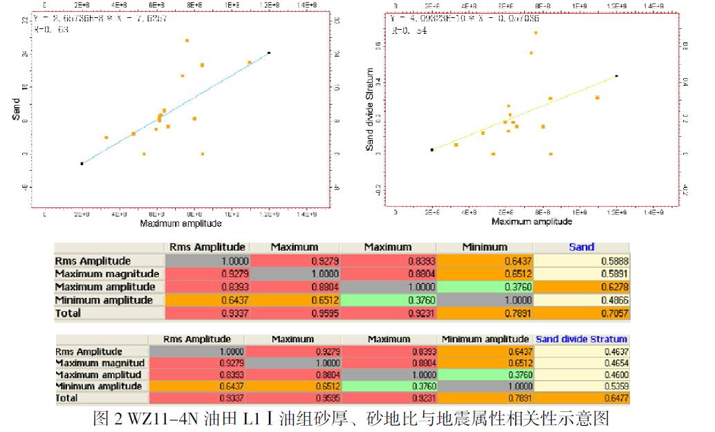 图 4 WZ11-4N 油田 L1Ⅴ油组砂厚、砂地比与地震属性相关性示意图