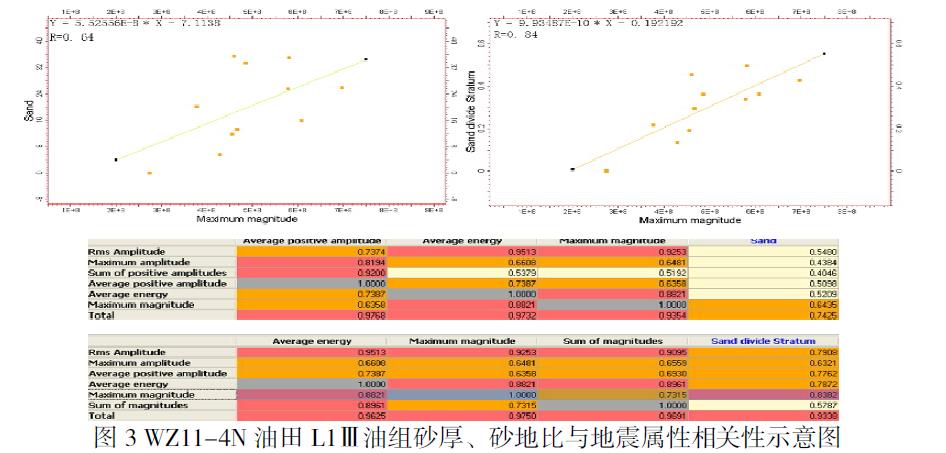 L1Ⅲ油组储层砂地比与最大能量属性相关性好(图 3),其中砂地比与最大能量振幅相关系数可达0.84,能量属性图上颜色越红(能量越强),其含砂率就越大。