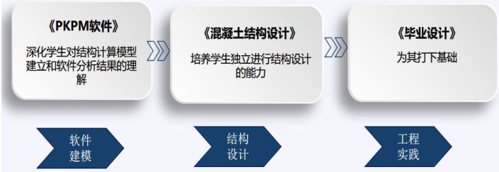 混凝土结构设计课程作为建筑工程专升本专业大二的核心课程,在“软件建模-结构设计-工程实践”的能力链培养中起着承上启下的作用,如图 1 所示。该课程深化学生对 PKPM 软件中结构计算模型建立和软件分析结果的理解,又为后续的毕业设计打下基础。