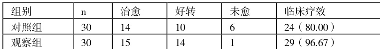 2.1 临床疗效对比临床疗效经SPSS统计,观察组高于对照组( P<0.05 )