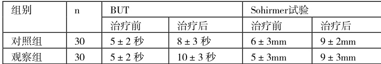 1.4.3 临床指标,在治疗前与治疗后,监测并记录荧光素染色BUT检查、Sohirmer试验等指标。