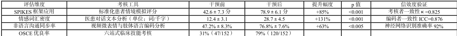 SPIKES 框架应用:评分从 42.6 分升至 78.9 分( +85% , p<0.001 ),直接驱动病情告知时间从5.8 分钟延长至17.2 分钟( +196% ),体现医生更注重信息传递的完整性与患者情绪响应;患者满意度从41.7%跃升至 88.9% ( +113% , p<0.01 ),与非语言行为匹配度( 76.8% )及情感词汇使用频率(28.7 词/千字)高度相关,验证人文关怀对临床信任的促进作用。情感词汇密度:从 12.4 词/千字增至 28.7 词/千字( +131% , p<0.001 ),配合非语言沟通同步率提升( 47.2% 76.8% , +63% ),反映医患互动中语言与非语言表达的协同优化。OSCE 优良率从 31% (47/152)提升至 79% (120/152),得益于 SPIKES 规范性( κ=0.82 )、及非语言行为量化技术(识别率92% )的整合应用,体现了肿瘤内科研究生经过“安宁疗护”课程培养后共情能力及医患沟通胜任力得到了显著提高。