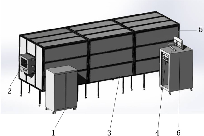1-闪光光源驱动系统、2-光源系统、3-暗室、4-电子负载、5-测试框架、6-PC 机