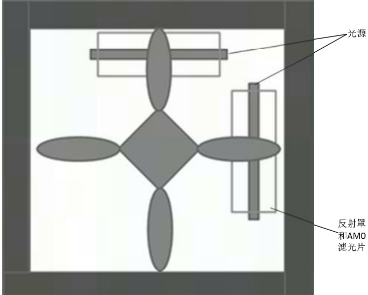 光源系统包括光源、聚光系统和滤光系统;聚光系统和滤光系统均包含反射罩和 AM0 滤光片;其中,反射罩设置在光源系统的最底层,光源设置在反射罩的中心轴线上,AM0 滤光片紧贴在反射罩的表面。聚光系统对光源产生的光进行收集,让其更加有效地投射到测试面上,从而在测试面实现最佳的亮度和均匀性。滤光系统可以有效过滤能量较高的光谱波段,使光源产生的模拟光在350-1800nm 各个波段有效匹配太阳光。