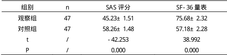 比较两组干预效果,干预后观察组 SAS 评分显著低于对照组,生活质量评分明显高于对照组,差异具有统计学意义( P<0.05) 。