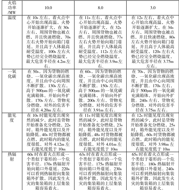 当火源功率为 10.0、8.0、3.0MW 时,将人体耐受温度设置为 20℃到 60℃,温度超过此值会对人体造成危害,按照高温出现、火势扩大、货物引燃并向箱门蔓延的顺序,仿真结果如表 3 所示。