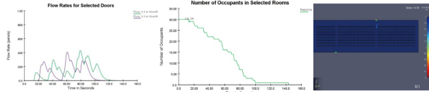 以得到该模拟效果显示危害半径都在 4m 左右,这是因为集装箱是一个密闭的环境,火灾产生的烟气和热量只能从箱门开口的方向发散,主要由于烟气和气流影响,火灾产生的烟气先到集装箱的顶部,一部分沉降,一部分再向箱门开口处流动,形成烟雨流,其中燃烧的粒子形成热对流,其中主要是烟气向上飘动影响热辐射和危害半径,因此在后续人员疏散模型,建立堆场模型,设置各个堆场的左右间距为 6m,堆场集装箱之间间距为 4m⨀ 。模型中不同时间段内,两个紧急逃生出口的利用率、人员逃生速率、人员逃生距离如下图所示。