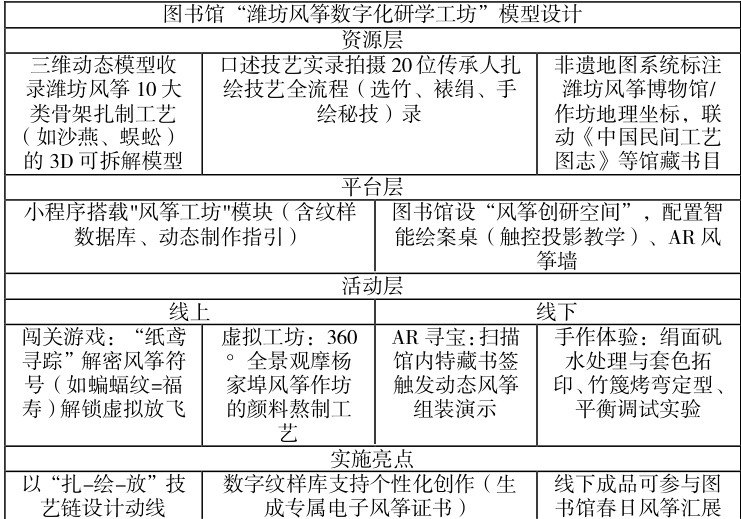 以山东青少年为目标的突出山东特色的文化性、教育性以及与科技融合相融合的研学服务设计模型,图书馆应该从资源层、平台层、活动层三个方面逐一深入,线上线下相结合,打造经典案例。同时,研学课程设计应遵循生动性、实践性、沉浸式三个原则[4]。我们在此以图书馆“潍坊风筝数字化研学工坊”为例进行演示: