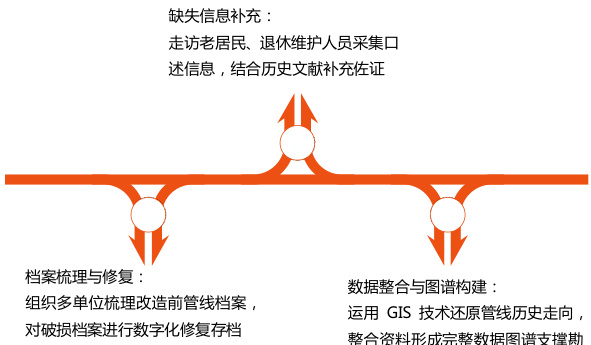解决旧城管线历史资料缺失问题,要构建系统溯源机制。档案管理、住建和管线权属单位协同,专项梳理改造前管线施工图、竣工图、维护记录等纸电档案,破损档案数字化修复存档。没直接档案的区域,走访老居民、退休维护人员采集口述,结合历史地图、变迁文献与早期航拍影像,用 GIS 技术还原历史管线走向,生成完整数据图谱辅助现状勘察(见图 1)。