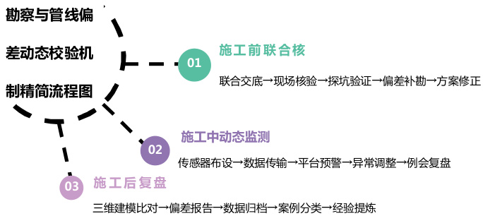 照旧城改造基础设施系统性改善要求,施工完毕后进行全面复核,施工单位组织专业团队用三维激光扫描技术对改造区域管线全覆盖扫描,生成实际分布三维模型,与施工前勘察模型叠加比对,量化偏差范围与程度。对明显偏差区域形成专项报告,记录位置、成因、处理结果并附佐证数据,将复核数据纳入数据库更新归档,建立偏差案例库分类整理,定期研讨提炼优化建议与管控要点,为后续项目提供参考(见图3)。