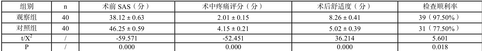 比较两组干预效果,观察组术前 SAS 评分、术中疼痛评分显著低于对照组( P<0.05 )。术后舒适度评分和检查顺利率:观察组明显高于对照组( P<0.05 )。见下表 1,