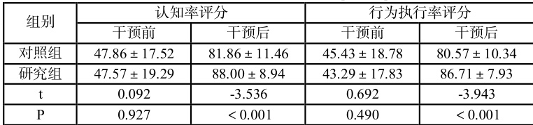 注:两组干预前后认知率和行为执行率提升度改变差异显著, P<0.05 ,有统计学意义。