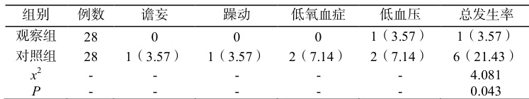 (1)不良事件发生率:对患者进行随访、观察,对其出现的麻醉相关不良事件发生类型、例数进行统计,包括谵妄、躁动、低氧血症等;统计总发生率。(2)应激反应指标:分别于术前、术中进行生命体征监测,对患者的应激反应指标进行记录,包括心率、收缩压、舒张压。