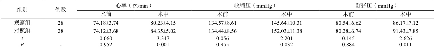 术中观察组各项应激反应指标水平均低于对照组,( P<0.05 )。见下表 2: