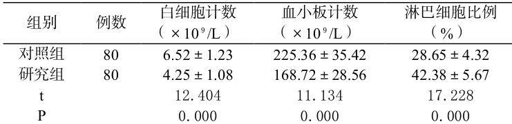 研究组白细胞计数、血小板计数低于对照组,淋巴细胞比例高于对照组( ρP<0.05 )。见表 1。