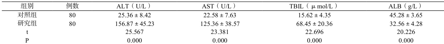 研究组 ALT、AST、TBIL 水平高于对照组,ALB 水平低于对照组(P<0.05 )。见表 2。